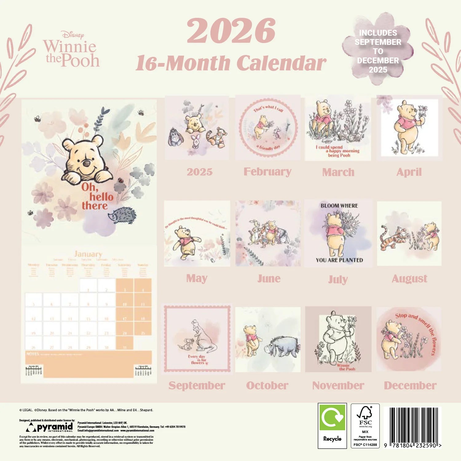 The WINNIE THE POOH 2026 Square Wall Calendar is an official Disney-licensed 16-month calendar featuring beloved classic characters. Its compact square format makes it ideal for any room, while the extended 16-month layout ensures planning well beyond the new year. Perfect for families, children, and nostalgic fans alike, this calendar combines practical scheduling with timeless illustrations, making it a thoughtful gift that brings a touch of Winnie the Pooh’s charm into everyday life.
